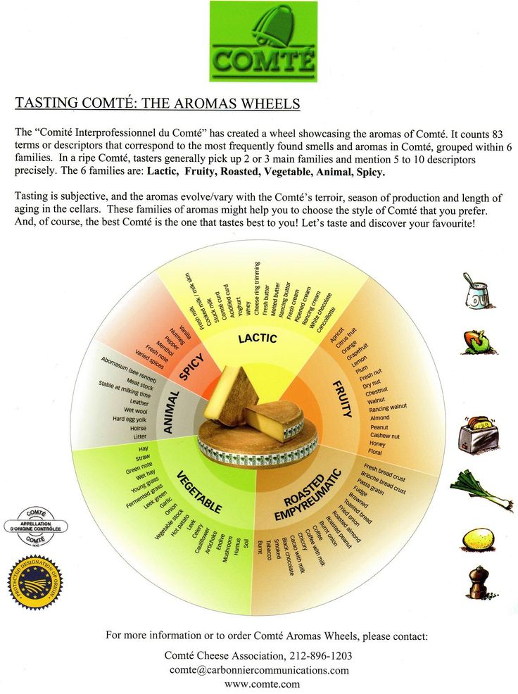 (f) So many factors affect the taste of the cheese (e.g. the microclimate of the area the cheese is produced in, the time of the year the milk is collected, the time allowed for maturing etc) and every cheese wheel differs in terms of smell and taste – Just look at the aroma wheel below. Generally however, a young Comte will have a milkier taste and aromas, while more mature cheeses can have fruitier (citrus and hazlnut) and smoky flavours.