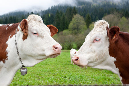 (b) The milk used to make the cheese comes from Montbeliarde cows which eat only grass and hay and are recognizable by their dark red and white coats. They are milked twice a day at regular times to avoid stressing the animals.