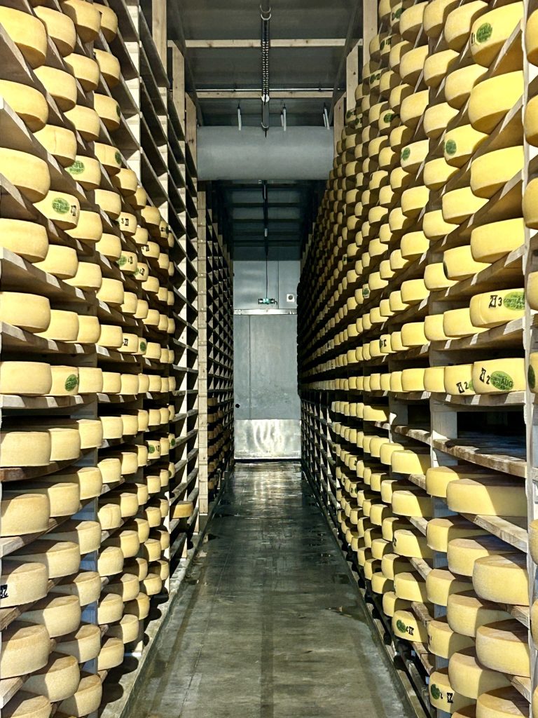 (d) The cow’s milk, with a fat content of not less than 45%, is transported to large copper vats. A few centilitres of natural rennet (obtained from the dried intestine of a calf) is added to help clot the milk and the resulting curd is then stirred and heated to 54 degrees centigrade for 1 hour. The curd is then drawn off and pressed into cheese wheel moulds before being stored in the fromagerie’s cellars to mature.