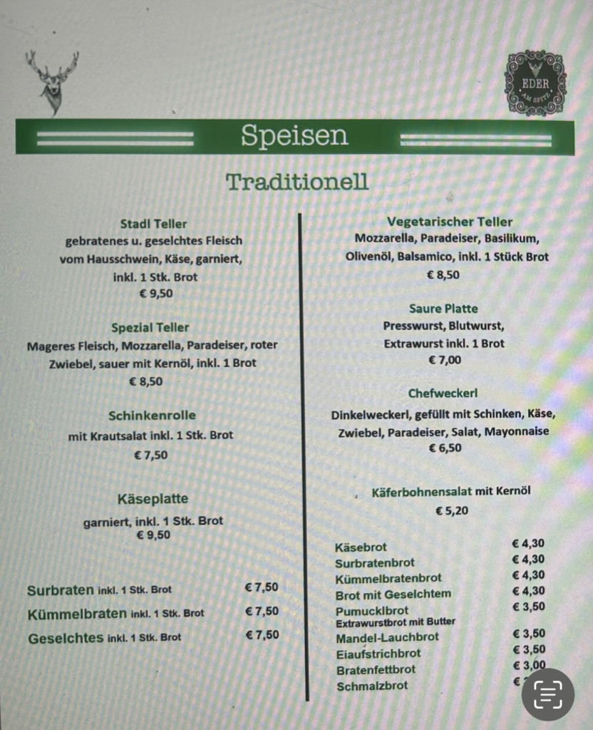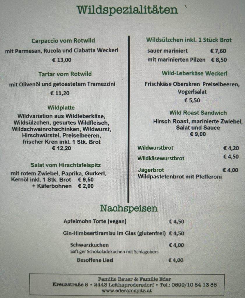 The Eder Am Spitz specialises in game served cold. Indeed, none of their dishes are even warmed let alone served hot. That doesn’t sound all that tempting but, there is plenty of choice and the chefs endeavour to ensure each dish is as visually appealing as it is delicious. I chose one of the many venison dishes and it was first class.