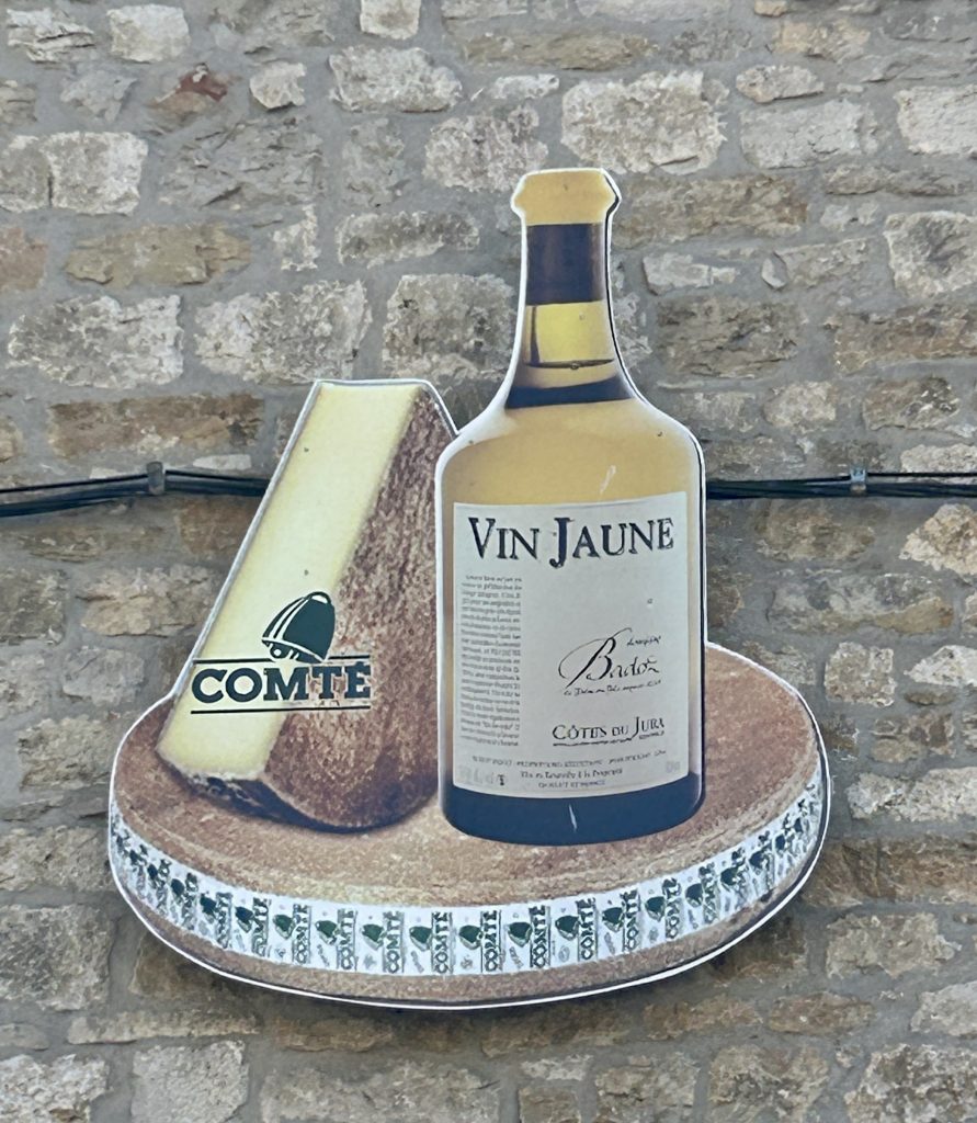 Not long after we were esconced in a wine shop in Poligny tasting yellow wine. Well, I was. It’s a strong wine (see the Arbois blog) and it’s not to everyone’s taste – certainly not Vanya’s. This was in the ‘Fruitiere Vinicole d’Arbois’. There are 5 such shops (all part of a co-operative); two in Arbois, one in Arc et Senans, another in Saint Laurent en Grandvaux and the one in Poligny on Grande Rue known as the ‘Caveau des Jacobins’. What a great wine and have I mentioned in any of my blogs that it is even better when paired with Comte cheese? It’s a marriage made in heaven.
