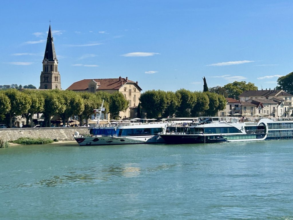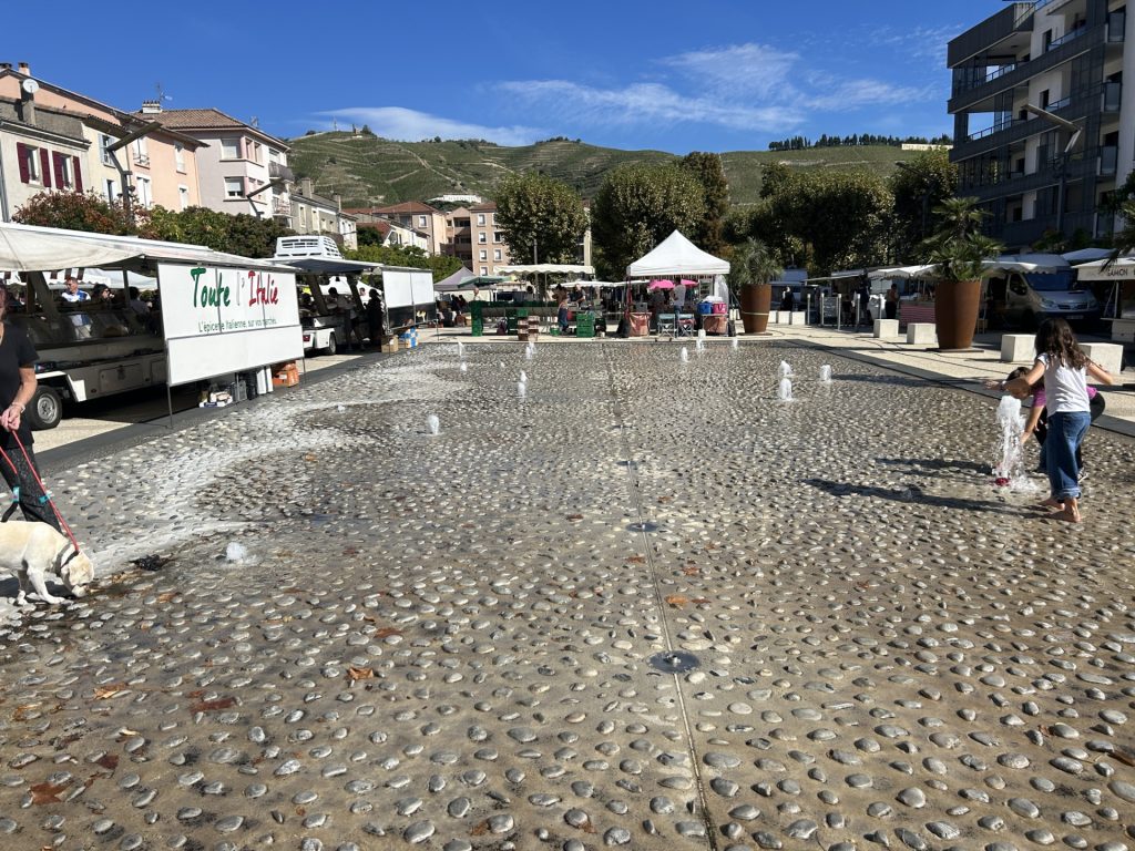 Vanya and I popped into Tain early on a Sunday afternoon, after first visiting the Tournon farmer’s market. We didn’t realise Tain’s market day was also on the Sunday morning or we might have strolled across the Marc Seguin bridge earlier and enjoyed both markets. Neither market is very large but, together, I think there would have been enough to keep us amused for a while. We both enjoy mooching around French markets. Having said that, I was up early that day and had noticed two river cruise boats moored on the Tain side of the Rhone and was happy to wait until they had departed before crossing the river.